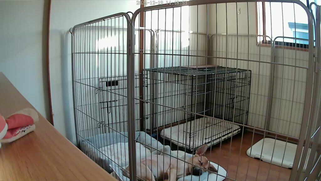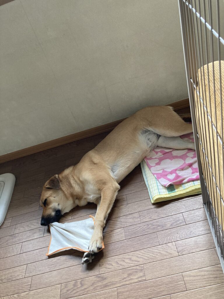 1日中寝ている。食事は1日3回。チキンを食べると調子が悪いと報告があったので、白身魚メインのドックフードを食べているが、あまり食いつきは良くない(後にヤギミルクを振りかけて与えてみると、食いつきが良くなった)