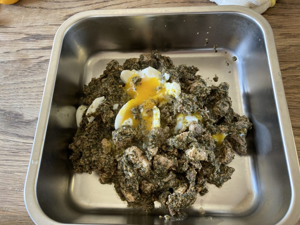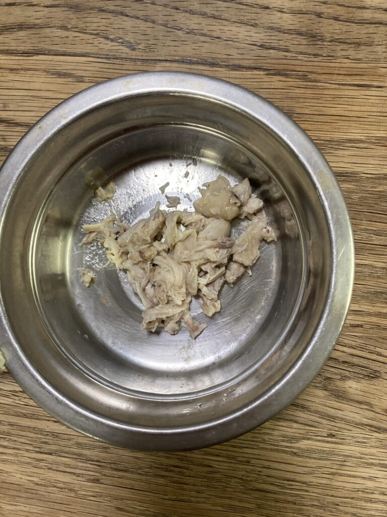 さてここからどうする?一応食事全体量の半分まで鶏混ぜ込み成功。次はトッピングに、手羽中(生食)に挑戦してみようか?