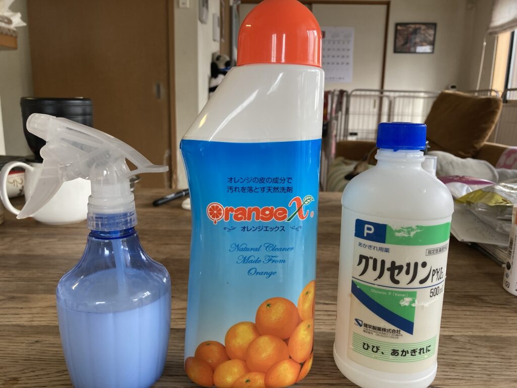 オレンジの皮から抽出精製した天然洗剤→私は50倍に薄めて霧吹きでタオルに吹き付け(タオルを湿らせて)犬の身体の汚れをふき取っている。この時グリセリン5%(保湿のため)を混ぜて使用。そうすることで肉球の乾燥が防げると思う。但しグリセリンは3%ほどでいいと言う資料もあった。私は3%だとあまり効果を感じられなかったので5%で使用している。